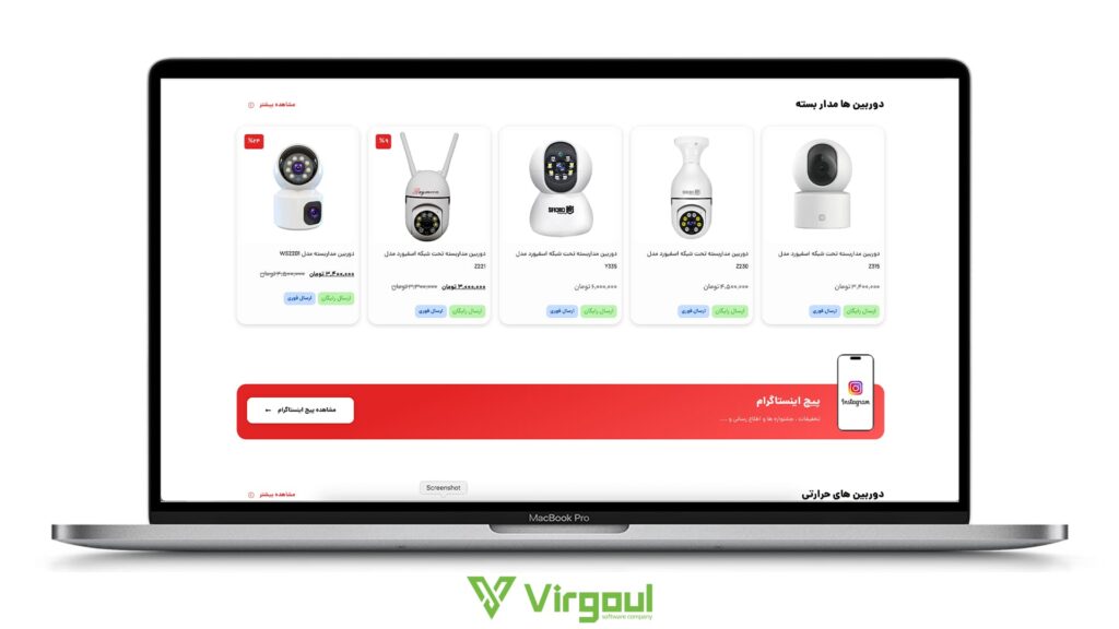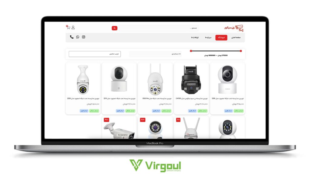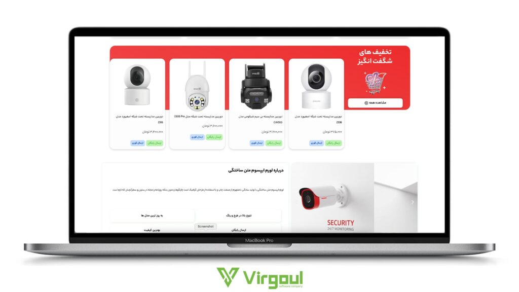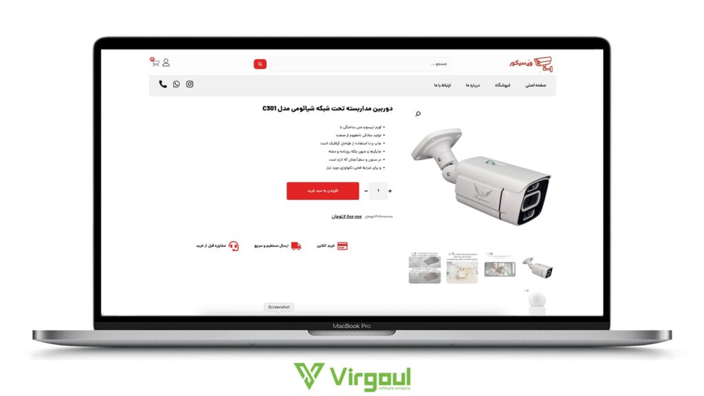 دوربینهای مداربسته کالاهایی فنی هستند. مشتری نیاز دارد تصاویر باکیفیت و مشخصات دقیق محصول را ببیند. طراحی شلوغ و بینظم، حس غیرحرفهای بودن را منتقل میکند. سایت آماده ویرگول با استایلی مینیمال و شیک طراحی شده است. استفاده از رنگهای صنعتی و چیدمان منظم، باعث میشود تا محصولاتی مثل دوربینهای دام، بولت و دستگاههای DVR با ظاهری مهندسیساز و جذاب نمایش داده شوند.